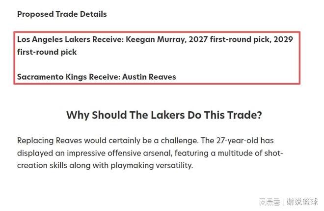 低季节的一半以上已经过去。湖人的一致性发生了变化,但似乎不足。与湖人续约合同的续约协议也在站立,尤其是因为詹姆斯很可能下个赛季继续减少。在众神战斗的西方,这可能是非常有问题的。媒体前锋向湖人提供了与国王打交道的建议,尤其是如果他们可以试图开除奥斯汀·里夫斯。从特定计划来看,湖人可以更改前后明星Keegan Murray和两个以后的第一轮选拔。如果他们真的需要与里夫斯退休,那么应该说,如果湖人得到这么多技巧,湖人一定会受益。作为一名非招聘选秀,里夫斯从小就一直是湖人队的粉丝。选秀中有传言说,里夫斯要求在第二轮选择中选择几支球队。他只想为湖人队效力。但这无关紧要Y是,里夫斯终于与湖人签约,近年来一直在不断进步。里夫斯尤其上个赛季进行了转变。他成为高质量团队的第三名领导者,即使在他的领导下,他也只有不断的表现。但是,在季后赛的第一轮比赛中,湖人队遇到了森林狼。他们之所以遭受六年悲剧性停电并被绅士淘汰的原因,这就是为什么沉没的里夫斯州如此重要的原因。除了发动攻击,如果他没有那么多的哨子,他的防守失败将被完全剥削。湖人仍然非常可耻,因为里夫斯将成为明年夏天的自由球员。公平地说,里夫斯的合同仍然非常有价值,但是他和他的代理商坚持拒绝萨克洛克,并寻找长期的长期合同。里夫斯的人才是平均水平,他很难与唐·塞克(Don Sic)有着深刻的隐性理解和化学反应,因此湖人经理也应该考虑这一点。国王的一面与众不同。他们似乎正在寻找另一种重建。就里夫斯而言,萨克拉曼多的曝光率要比洛杉矶市场少得多。至少它赋予了灭绝,数据和潜在合同的无限权利,这可以改善。湖人实际上获得了许多奖励。穆雷的能力不如里夫斯那样糟糕。他只是一个平庸的人,是工程学的最前沿。但是,湖人将使核心核成核。从团队的一般角度来看,穆雷应该比里夫斯更适合湖人的未来发展,而要换取他的选秀权。