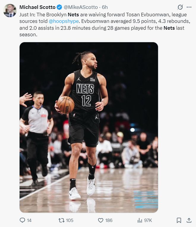 8月30日,NBA记者迈克尔·斯科特(Michael Scott)在8月30日透露,NBA记者迈克尔·斯科特(Michael Scott)裁定了Elboma双向合同前锋的合同。上个赛季,他在网络上平均每场比赛23.8分钟,赢得9.5分,4.3个篮板和两次助攻。 Nets还感谢Evoma的贡献。因此,有两个位置可容纳两项两项合同,因为只有一个人留在网络的双向合同列表中,Etienne。 NetMedianet每天都会写下以下内容:网络削减了精灵后,网络将具有两个剩余的双向分配。 Zeng Fanbo身高2.11米,23岁的Nelson是这两个位置的候选人,塞缪尔(Samuel)内的2.06米高度也可能是候选人之一。换句话说,Zeng Fanbo,Nelson和Samuel竞争了NET的双向合同的分配,并且很可能会选择2x 3。Zeng Fanbo于8月3日与Net签订了E10合同。继续在NBA追逐自己的梦想。 8月底飞往布鲁克林,与网络培训。如果您可以更改为双向协议,那么Zeng Fanbo可以保留在NBA中。 Zeng Fanbo在上个赛季的28.1分钟的比赛时间内捐出了14.7分,4.7个篮板,1.9助攻,0.8钢和1.5个盖帽。他的才华肯定是CBA的首位。他在季后赛中受伤,现在正在康复。在低赛季,北京的男篮球队使赵鲁伊成为银河系战舰,但是Galaxy战舰的链接是Power Striker Zeng Fanbo。如果Zeng Fanbo没有Zeng Fanbo,Galaxy的战舰将失去螺旋桨。毕竟,保护Zeng Fanbo的边缘,快速攻击,篮板和三元组是谋杀运动。 Zeng Fanbo本人还加入了Nbadeberías,等待留下来玩耍。